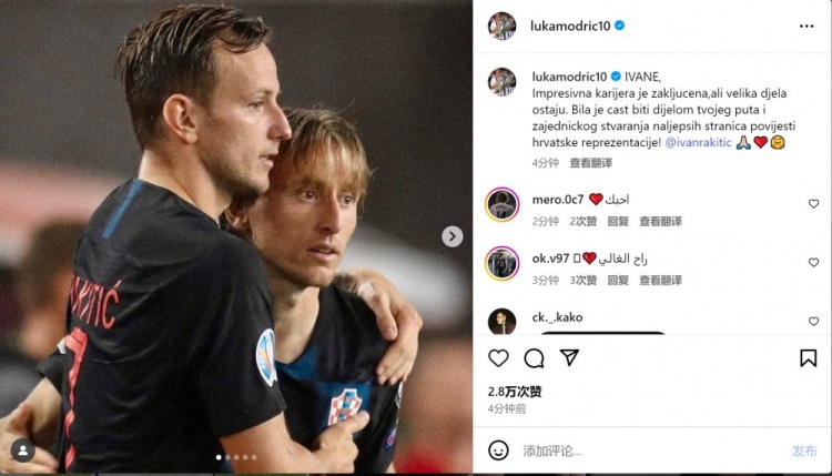 莫德里奇社媒曬出與拉基蒂奇在克羅地亞國家隊的合照,配文:“令人印象深刻的職業(yè)生涯已經(jīng)結束,但偉大的成就永遠存在。能夠成為你職業(yè)生涯旅程的一部分,并共同書(shū)寫(xiě)克羅地亞國家隊歷史上最美妙的篇章,我深感榮幸!”