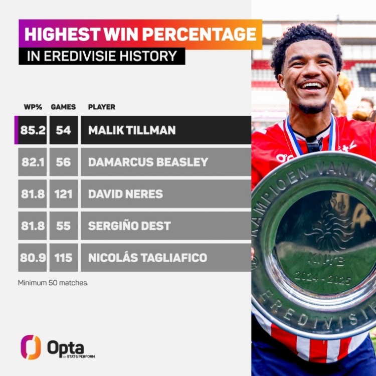 據統計,蒂爾曼是荷甲歷史上勝率最高的球員(出場(chǎng)至少50次),他在荷甲勝率為85.2%(46勝4平4負)。