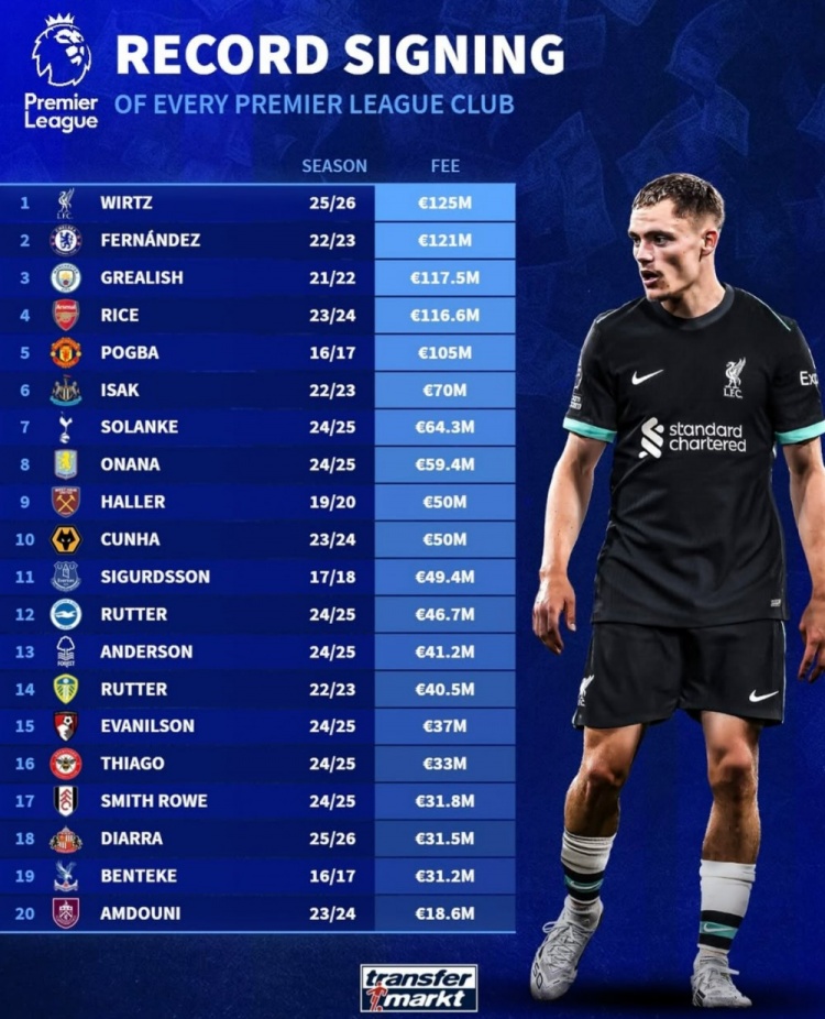 7月12日訊 德轉盤(pán)點(diǎn)了英超20支球隊隊史引援轉會(huì )費標王,其中維爾茨1.25億歐領(lǐng)銜,恩佐、格拉利什在列,具體如下: