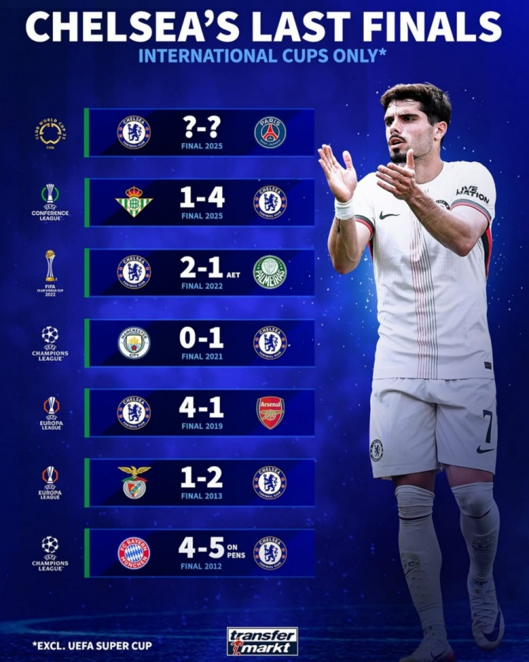 7月12日訊 世俱杯決賽將在巴黎與切爾西之間展開(kāi),德轉也盤(pán)點(diǎn)了切爾西近6次國際杯賽決賽的全勝表現(不包括歐洲超級杯):