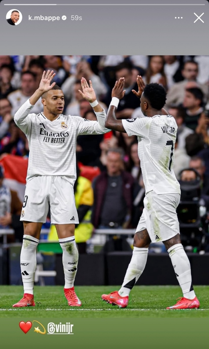 姆巴佩通過(guò)社媒曬出自己和維尼修斯擊掌慶祝的合照,并艾特了對方同時(shí)附上了愛(ài)心表情。