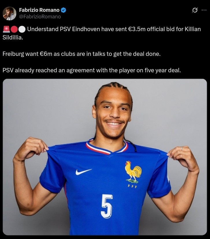 7月12日訊 據知名轉會(huì )專(zhuān)家羅馬諾報道,埃因霍溫正式為基利安-西迪利亞提供350萬(wàn)歐報價(jià)。