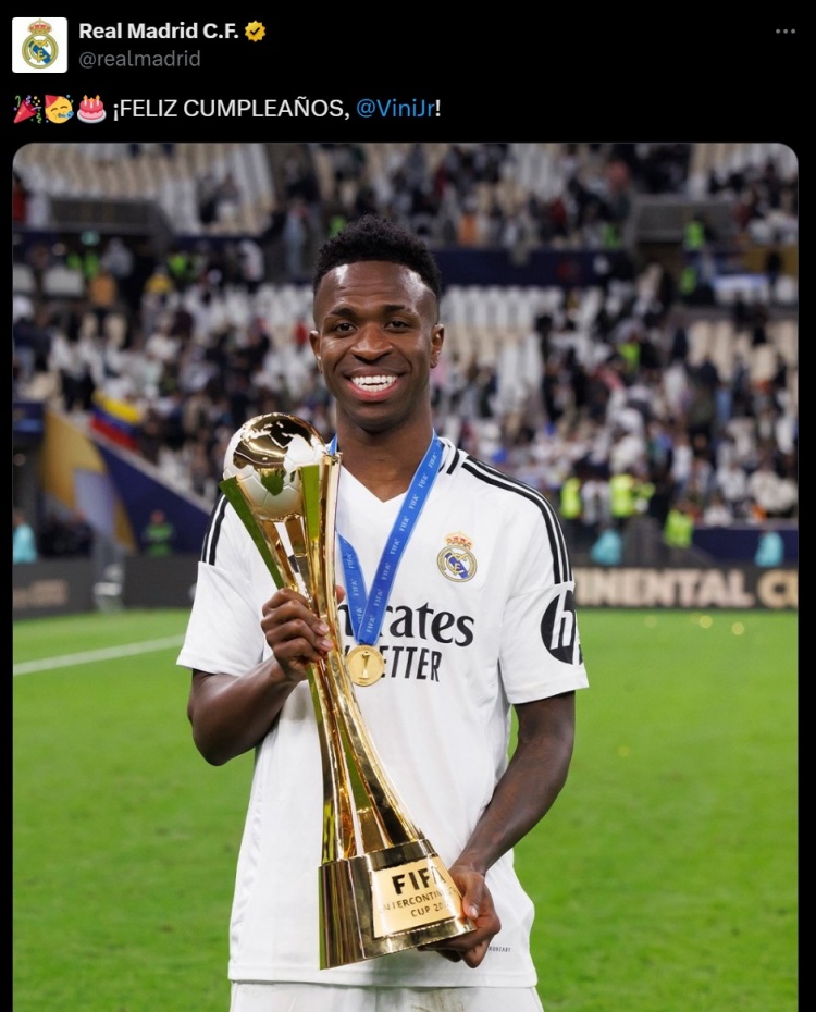 皇馬官方曬出維尼修斯本賽季贏(yíng)得洲際杯的照片,并表示:“生日快樂(lè ),@維尼修斯!”
