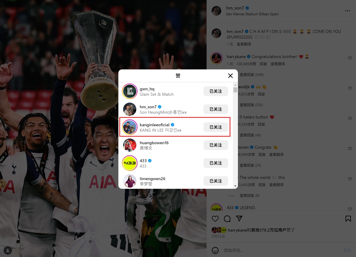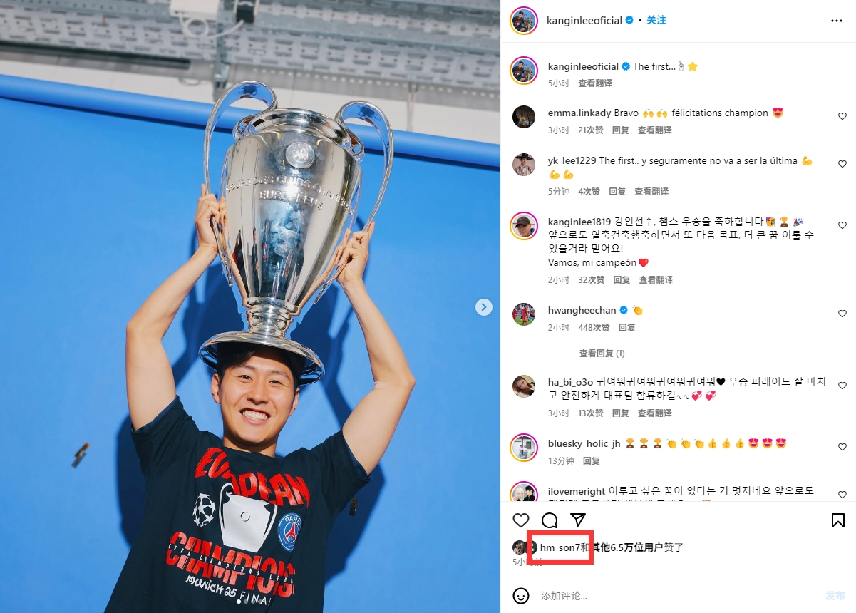 本賽季,熱刺奪得歐聯(lián)冠軍,此前孫興慜曬照慶祝時(shí)李剛仁也點(diǎn)了贊。