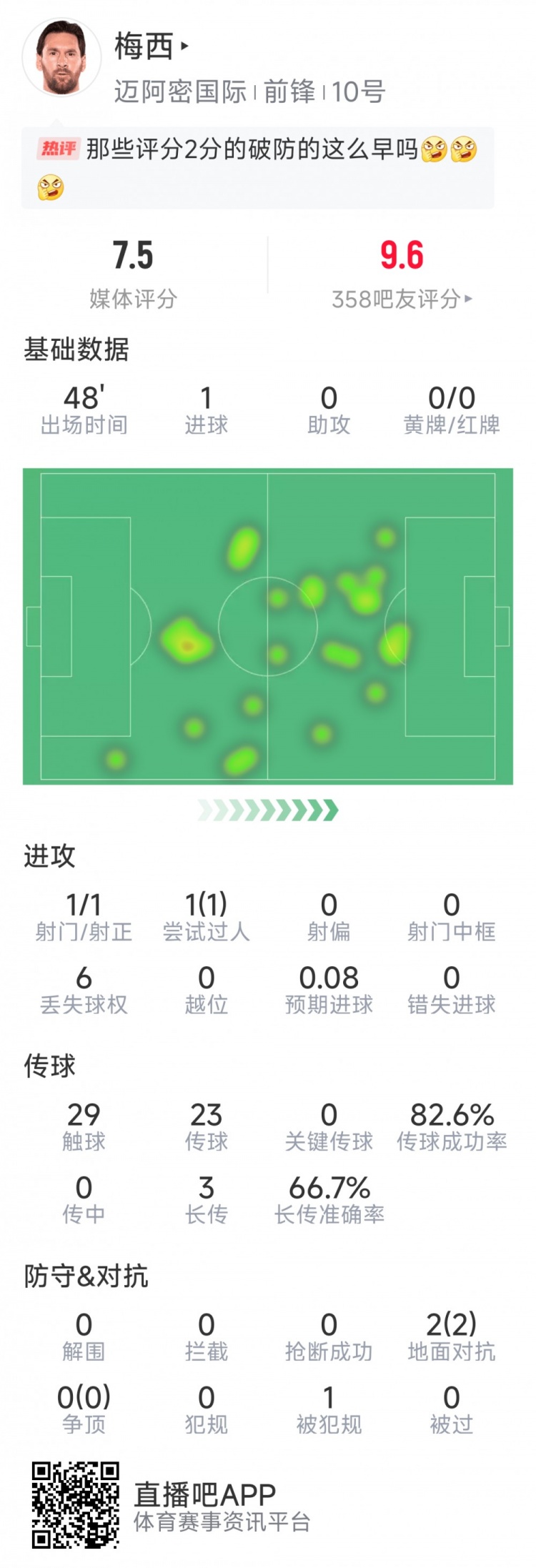 7月13日訊 本輪美職聯(lián)邁阿密?chē)H對陣納什維爾半場(chǎng)戰罷,邁阿密?chē)H憑借梅西進(jìn)球1-0領(lǐng)先,以下為梅西半場(chǎng)比賽數據: