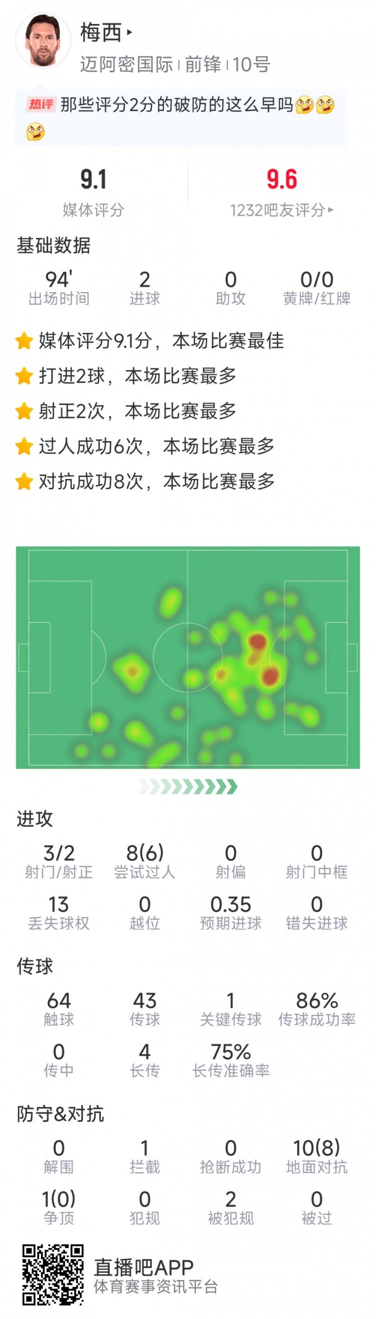 7月13日訊 在本輪美職聯(lián),邁阿密?chē)H2-1擊敗納什維爾,梅西梅開(kāi)二度,以下為梅西全場(chǎng)數據: