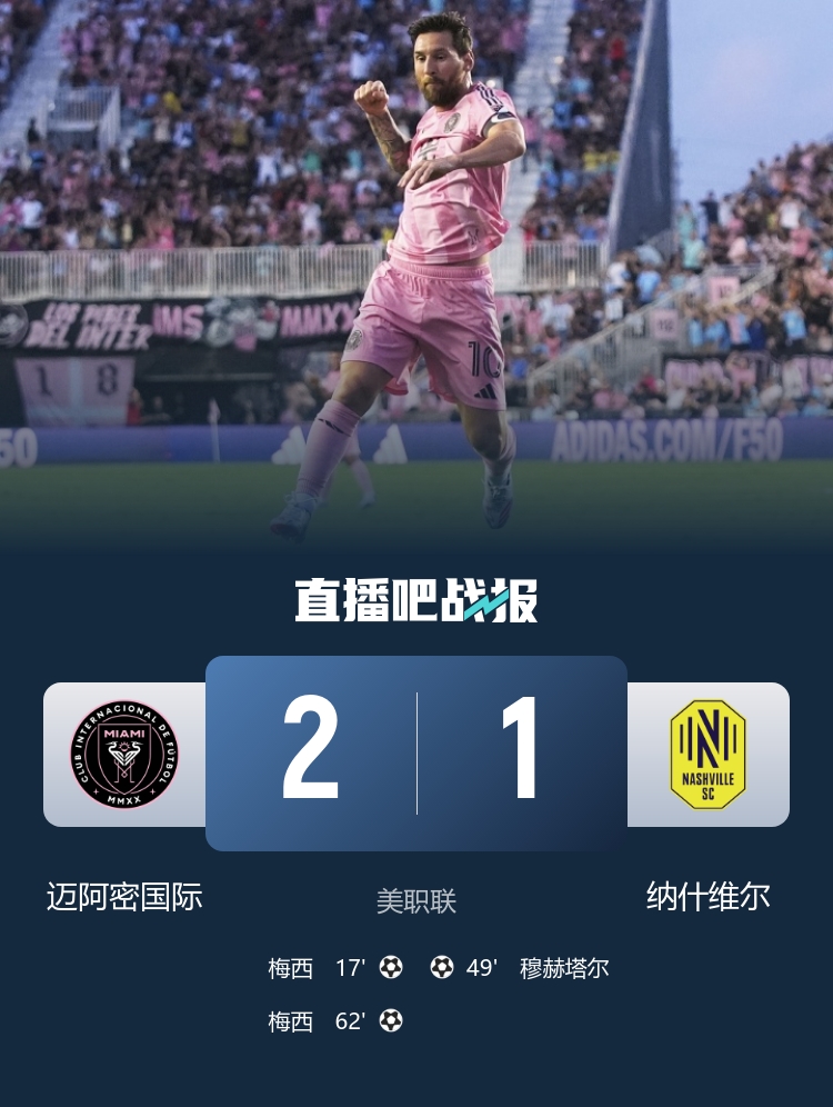 第62分鐘,納什維爾門(mén)將威利斯胸部停球,隨后傳球送大禮,梅西斷球過(guò)掉門(mén)將破門(mén)!連續5輪美職聯(lián)梅開(kāi)二度!近6輪11球4助!邁阿密?chē)H2-1再次領(lǐng)先納什維爾↓