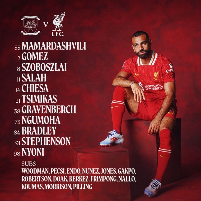 利物浦替補:56-伍德曼、60-佩奇、3-遠藤航、9-努涅斯、17-柯蒂斯-瓊斯、18-加克波、26-羅伯遜、50-本-多克、57-科爾克茲、59-弗林蓬、65-納洛、67-庫馬斯、68-莫里森、70-皮林