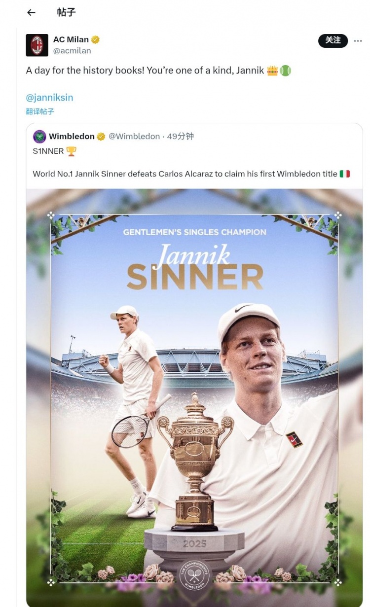 辛納在剛剛結束的溫網(wǎng)男單決賽中3-1逆轉擊敗阿爾卡拉斯奪冠,他也是著(zhù)名的米蘭球迷。