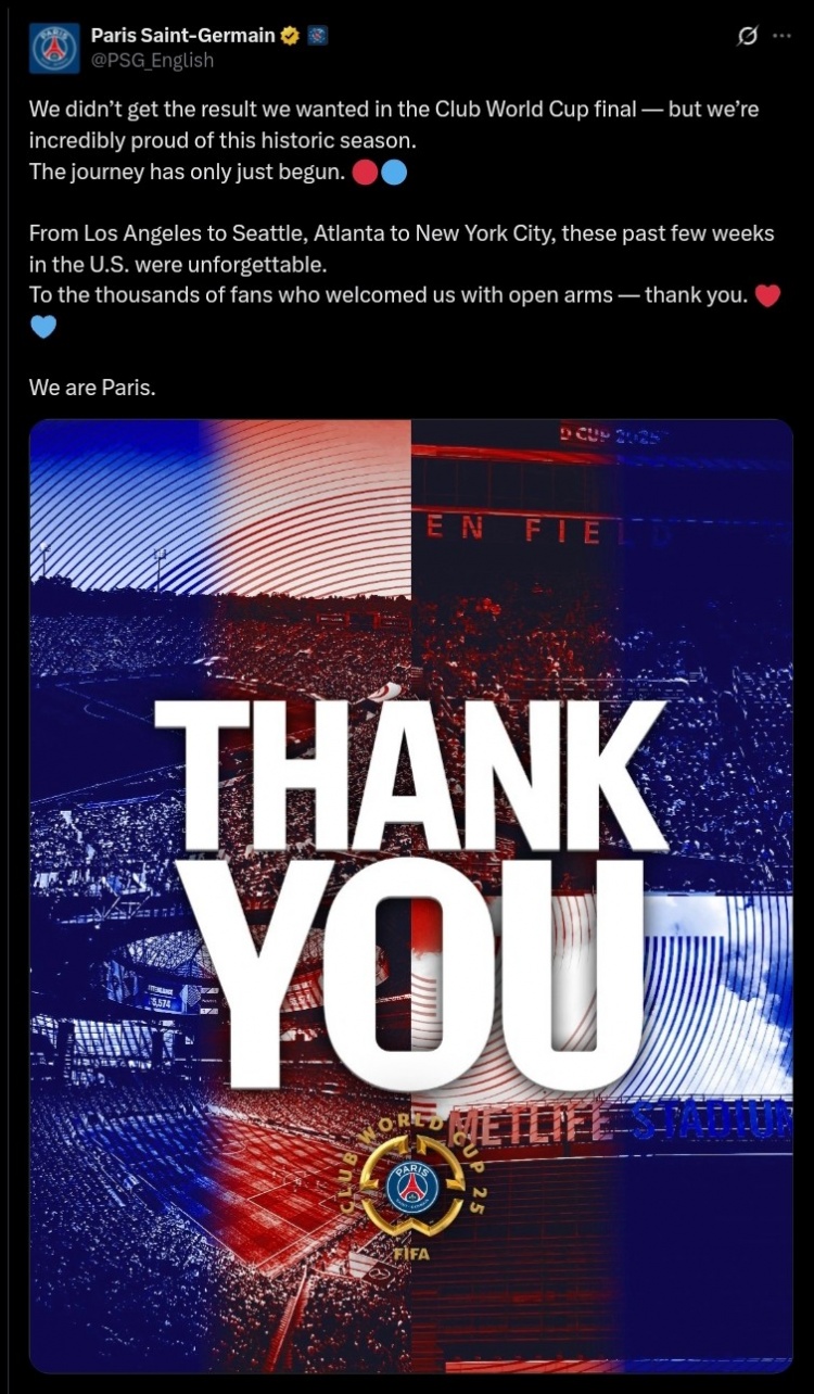 賽后巴黎官推也感謝了球迷的支持,配文寫(xiě)道:“我們在世俱杯決賽沒(méi)有獲得想要的結果,但是我們?yōu)檫@個(gè)歷史性的賽季感到無(wú)比自豪。旅程才剛剛開(kāi)始。從洛杉磯到西雅圖,從亞特蘭大到紐約,最近在美國的幾周令人難忘。感謝無(wú)數球迷對我們的熱情歡迎,謝謝!我們是巴黎!”