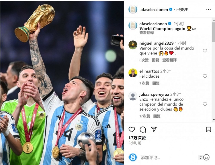 阿根廷隊社媒祝賀恩佐:再次贏(yíng)得世界冠軍??