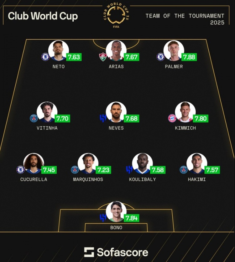 7月14日訊 世俱杯已經(jīng)完賽,sofascore也統計了本屆賽事評分最佳陣,切爾西、巴黎和利雅得新月各3將入圍。