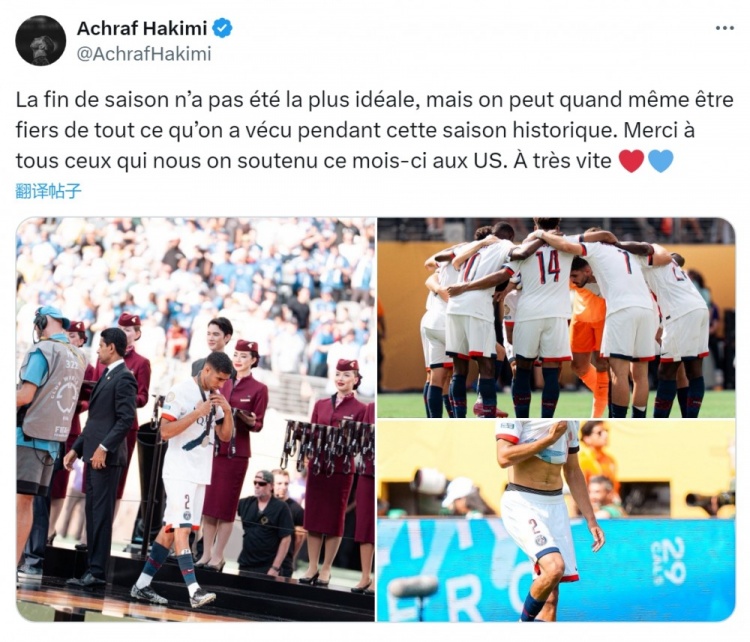 巴黎邊衛阿什拉夫社媒寫(xiě)道:“賽季的結束并不完美,但我們仍為這個(gè)歷史性賽季所經(jīng)歷的一切感到自豪,感謝本月在美國支持我們的所有人。很快再見(jiàn)!”