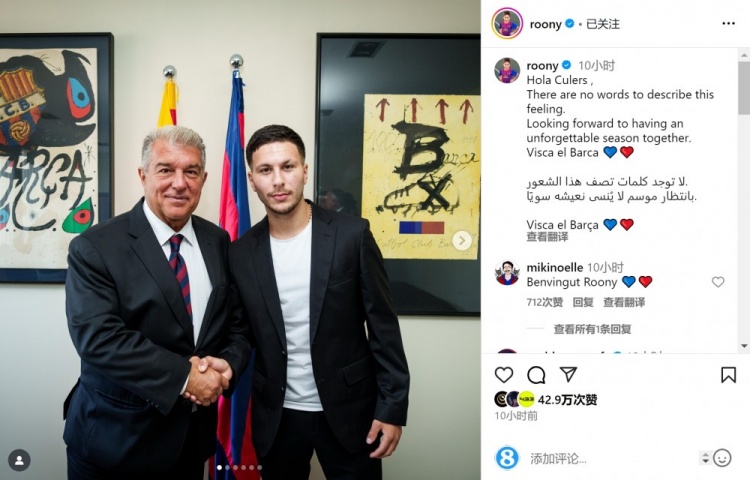 巴德吉社媒曬出與拉波爾塔的合照,并寫(xiě)道:“你好,巴薩球迷們!無(wú)法用言語(yǔ)形容這種感覺(jué),期待與大家一起度過(guò)一個(gè)難忘的賽季,巴薩萬(wàn)歲!”