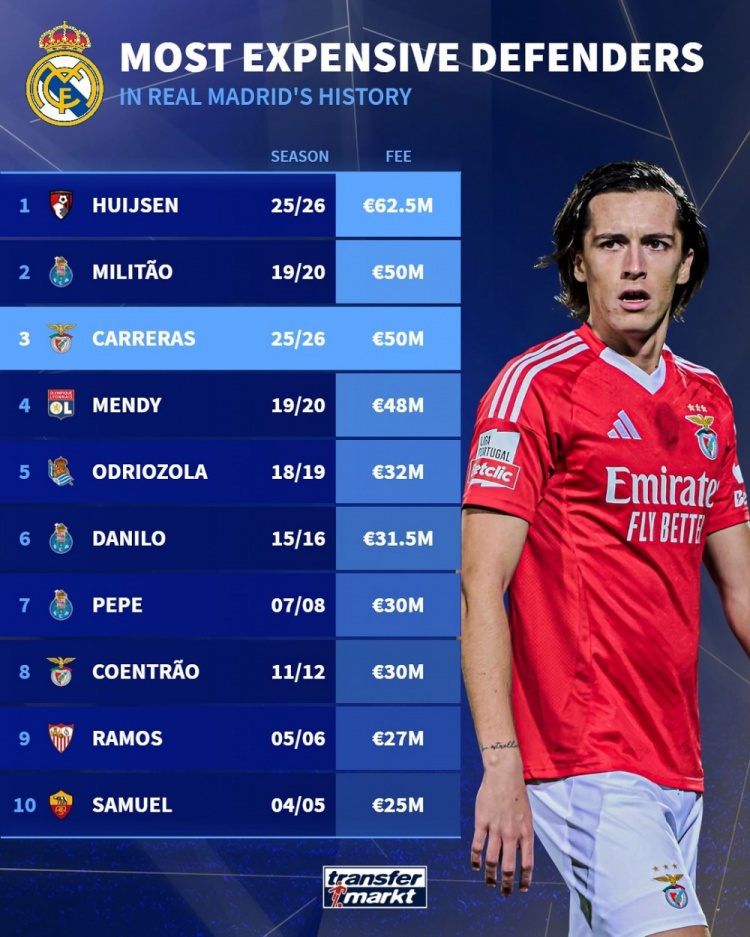 7月15日訊 本菲卡左后衛A費加盟皇馬,德國轉會(huì )市場(chǎng)統計了皇馬隊史引進(jìn)后衛的轉會(huì )費,并列出榜單,A費以5000萬(wàn)歐元排名并列第二位。