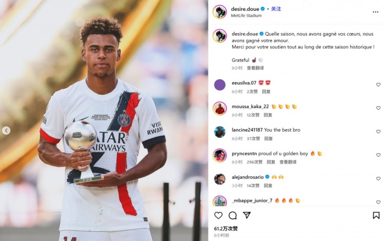 杜埃也在今日通過(guò)社媒曬出自己領(lǐng)取獎杯的照片,并配文:“多么精彩的賽季!我們已經(jīng)贏(yíng)得了你們的心,贏(yíng)得了你們的愛(ài)。感謝你們在這個(gè)歷史性的賽季里給予我們的支持!感激不盡?????”