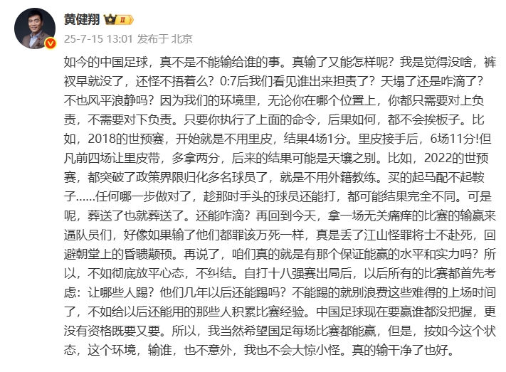 07月15日訊 著(zhù)名解說(shuō)員黃健翔在個(gè)人微博發(fā)文,談到了國足在本屆東亞杯收官戰前的輿論環(huán)境。黃健翔寫(xiě)道: