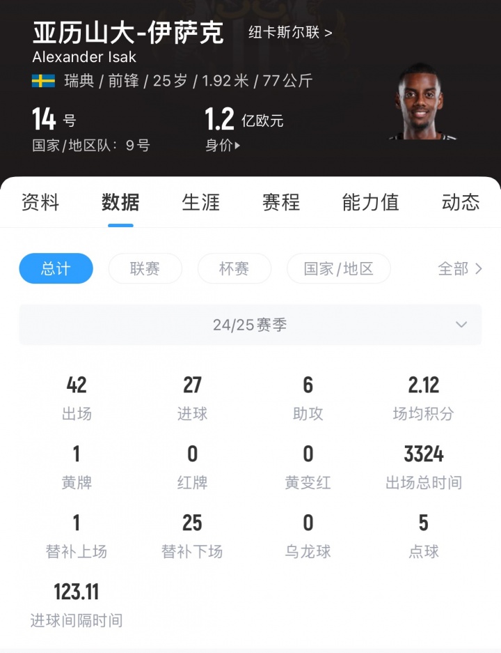 伊薩克現年25歲,目前德轉身價(jià)1.2億歐,他與紐卡的合同將在2028年到期。據此前報道,紐卡方面不會(huì )主動(dòng)賣(mài)伊薩克,他們要價(jià)至少1.5億鎊。