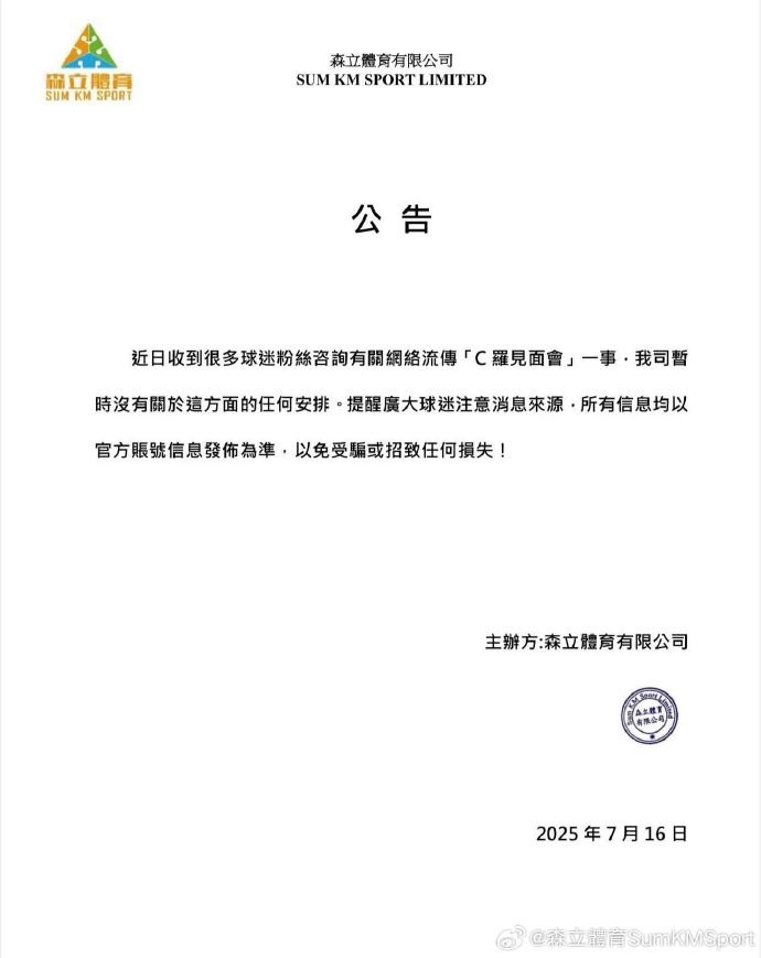 近日收到很多球迷粉絲咨詢(xún)有關(guān)網(wǎng)絡(luò )流傳「C 羅見(jiàn)面會(huì )」一事,我司暫時(shí)沒(méi)有關(guān)于這方面的任何安排。提醒廣大球迷注意消息來(lái)源,所有信息均以官方賬號信息發(fā)布為準,以免受騙或招致任何損失!