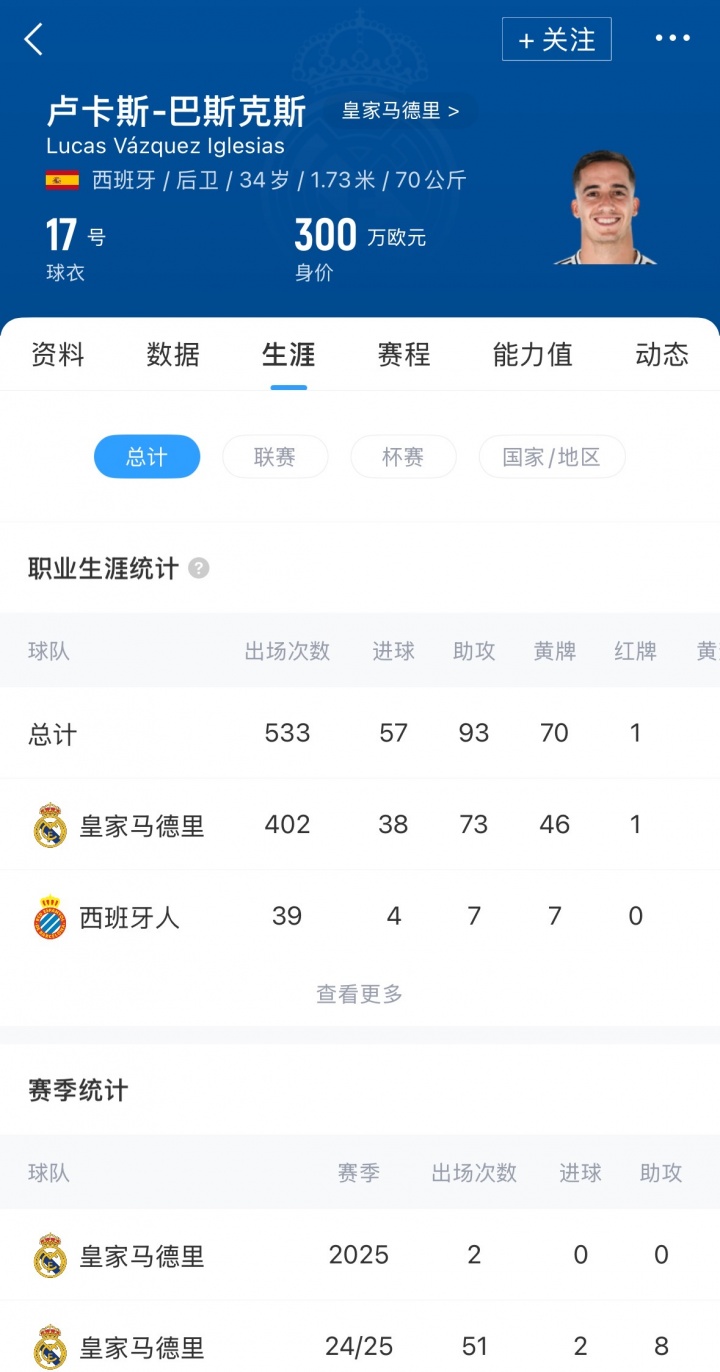 迄今為止,巴斯克斯為皇馬出戰402場(chǎng)比賽,打入38球。巴斯克斯本月初剛剛度過(guò)自己的34歲生日,他16歲加盟皇馬青年隊,至今已為球隊效力18年。
