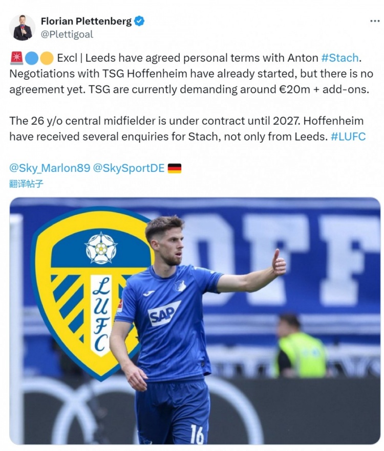 利茲聯(lián)與霍芬海姆的談判已經(jīng)開(kāi)啟,但尚未達成協(xié)議,霍芬海姆目前要價(jià)約2000萬(wàn)歐+獎金。