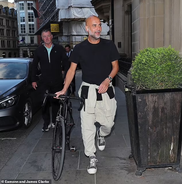 主帥瓜迪奧拉騎著(zhù)自行車(chē)汗流浹背地來(lái)到派對現場(chǎng)。