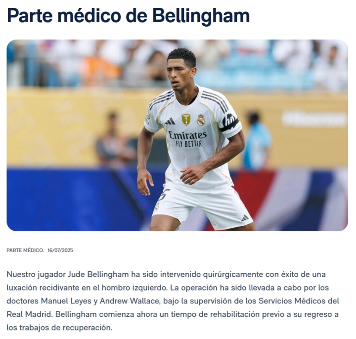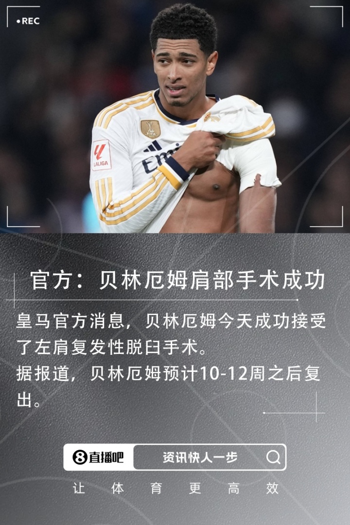 07月16日訊 皇馬官方消息,球隊中場(chǎng)貝林厄姆今天成功接受左肩復發(fā)性脫臼手術(shù)。據報道,貝林厄姆預計10-12周之后復出。