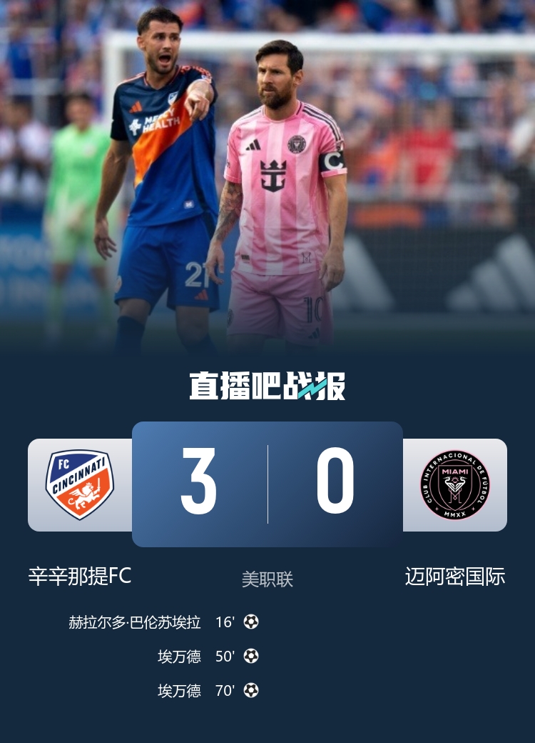 全場(chǎng)比賽結束,邁阿密?chē)H0-3辛辛那提。