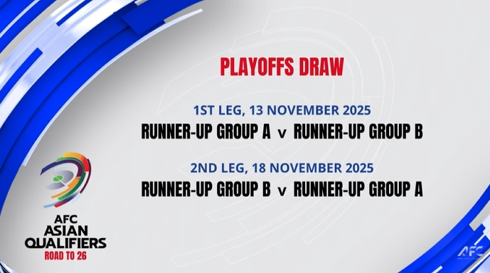 隨后兩個(gè)小組第二將在2025年11月13日及18日,進(jìn)行主客場(chǎng)兩回合對決,勝者代表亞洲參加洲際附加賽,對手包括1支非洲球隊、1支南美球隊、1支大洋洲球隊和2支中北美及加勒比海地區球隊。