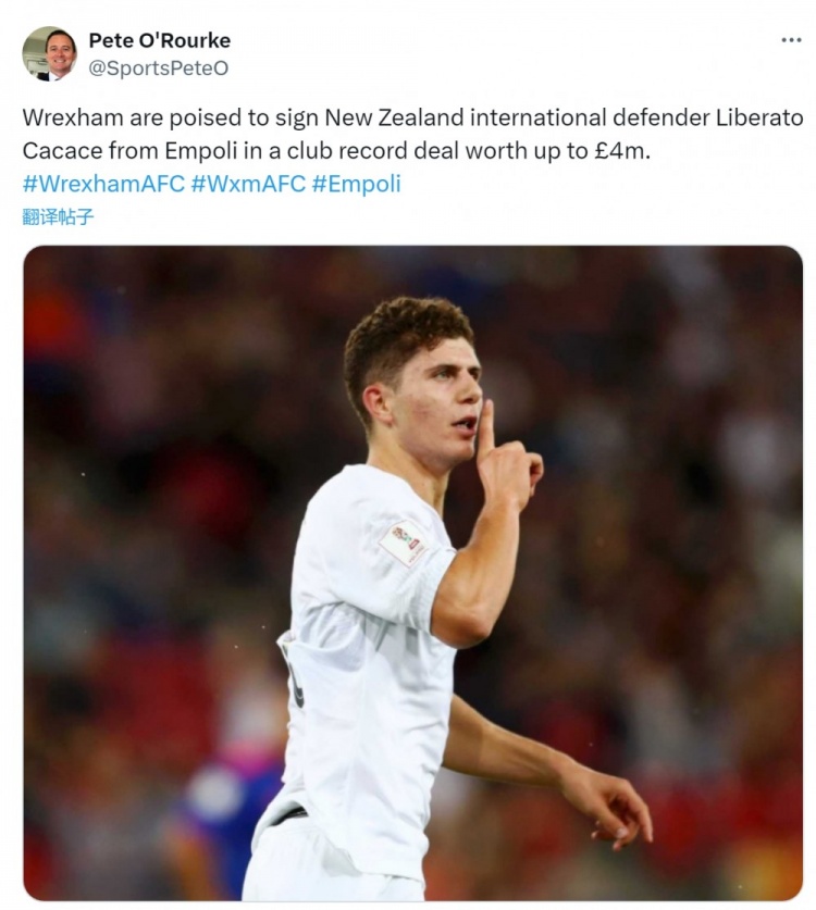 Pete O'Rourke透露,英冠俱樂(lè )部雷克斯漢姆準備從恩波利簽下新西蘭國腳卡卡塞,轉會(huì )費總價(jià)400萬(wàn)英鎊,這將創(chuàng )造俱樂(lè )部引援費用的紀錄。