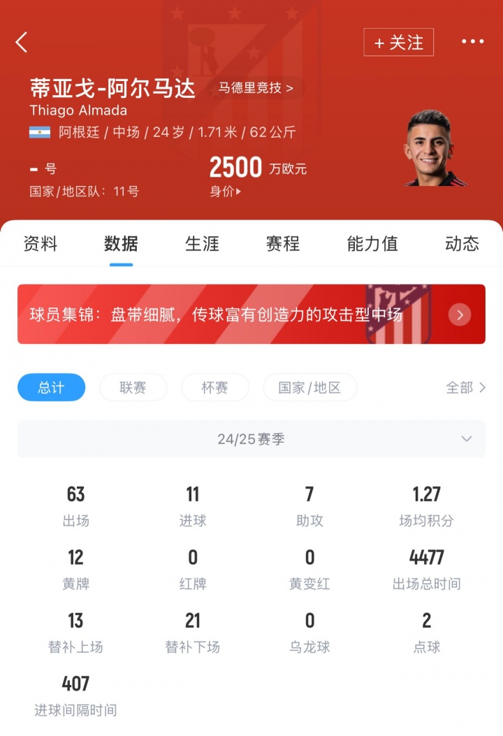 阿爾馬達現年24歲,阿根廷國腳中場(chǎng),目前身價(jià)2500萬(wàn)歐。24/25賽季冬窗,阿爾馬達從博塔弗戈租借加盟里昂,出場(chǎng)20次取得2球5助攻,其中法甲16場(chǎng)1球5助攻。