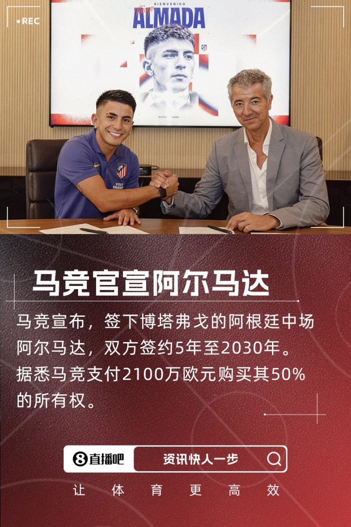 07月17日訊 官方消息,馬競簽下24歲阿根廷中場(chǎng)阿爾馬達,雙方簽約5年,根據此前報道,馬競將支付2100萬(wàn)歐,購買(mǎi)阿爾馬達50%所有權。