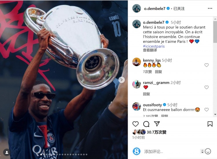 登貝萊社媒曬出多張上賽季奪冠和獲得個(gè)人榮譽(yù)的照片,并寫(xiě)道:“感謝大家在這個(gè)不可思議的賽季中的鼎力支持,我們共同書(shū)寫(xiě)了歷史,讓我們繼續攜手前行,我愛(ài)你,巴黎!????”