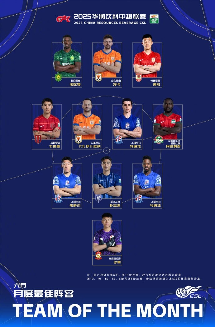 7月18日訊 中超官方公布了6月最佳陣容,本次最佳陣容采用3-4-3陣型。最佳陣容名單如下:
