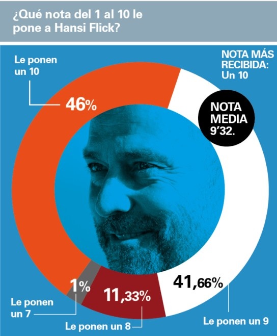 在執教的第一個(gè)賽季,弗里克的工作同樣收獲了優(yōu)秀評價(jià)。奪得這三座冠軍獎杯,隊內幾乎所有球員的明顯進(jìn)步,影響了最終獲得最高評分。46%的受訪(fǎng)者給他打出了10分,41.66%的受訪(fǎng)者則給了他9分,原因可能是在歐冠出局而不夠完美。平均分很高,達到9.32分。