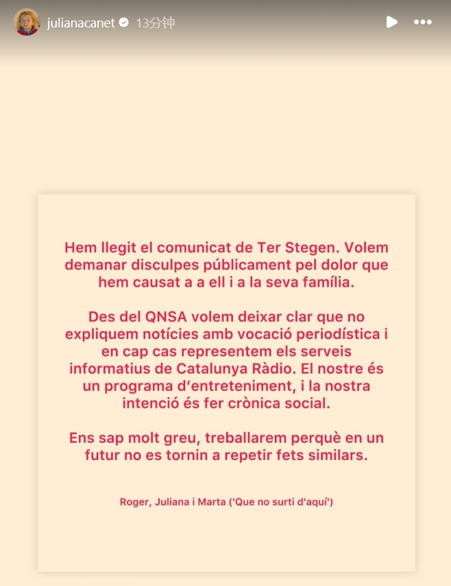 從節目《Que no surti d’aquí》的角度,我們想明確表示,我們并非以新聞視角報道事件,也不代表加泰羅尼亞廣播電臺的新聞服務(wù)。我們的節目是娛樂(lè )性質(zhì)的,我們的目的是進(jìn)行社會(huì )紀實(shí)。