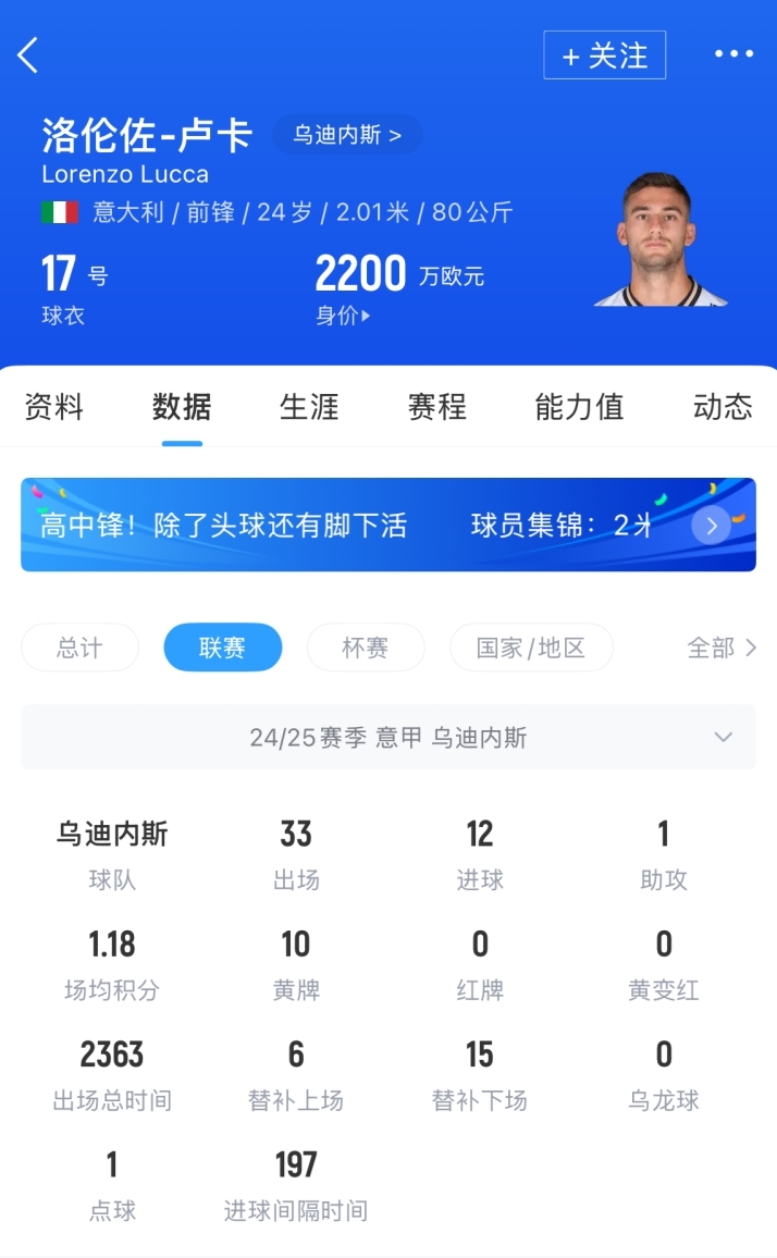 洛倫佐-盧卡現年24歲,身高2.01米,他上賽季為烏迪內斯出戰36場(chǎng),貢獻14球1助攻,目前他的身價(jià)為2200萬(wàn)歐。