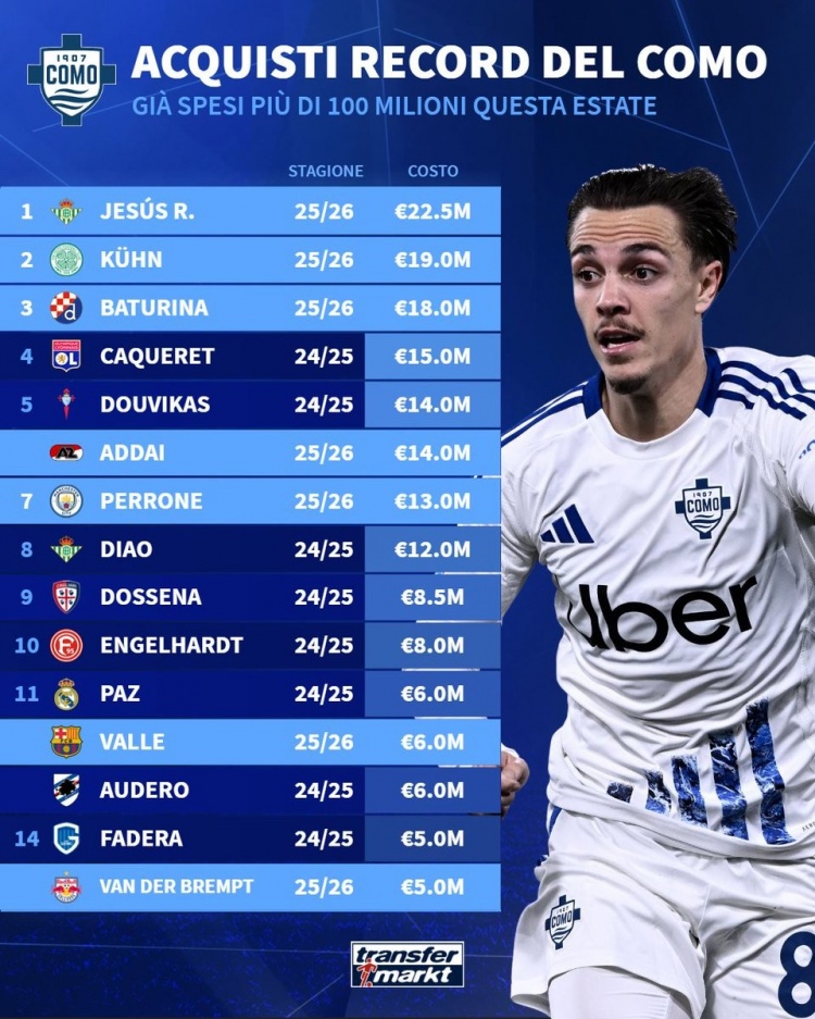 7月18日訊 德國轉會(huì )市場(chǎng)盤(pán)點(diǎn)了科莫隊史引援排行,今年夏天已花費超過(guò)1億歐。