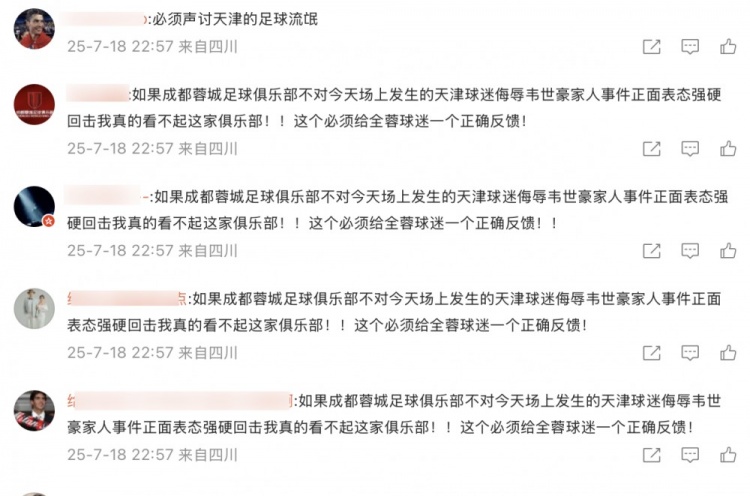 “如果成都蓉城足球俱樂(lè )部不對今天場(chǎng)上發(fā)生的天津球迷侮辱韋世豪家人事件正面表態(tài)強硬回擊我真的看不起這家俱樂(lè )部??!這個(gè)必須給全蓉球迷一個(gè)正確反饋!”蓉城球迷這樣的留言,幾乎刷屏了俱樂(lè )部官博的評論區。