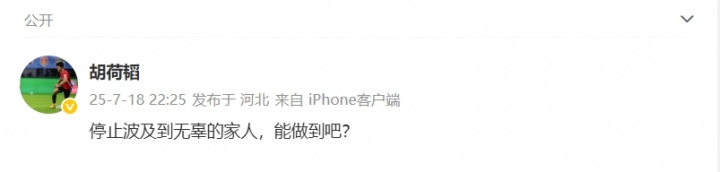 07月18日訊 今日中超成都蓉城vs天津津門(mén)虎,韋世豪遭天津球迷辱罵家人,隊友胡荷韜社媒發(fā)文:停止波及到無(wú)辜的家人,能做到吧?