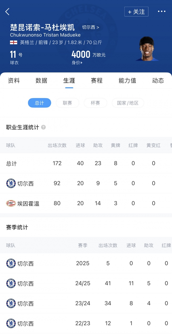 馬杜埃凱于2023年1月加盟切爾西,三個(gè)賽季共計為切爾西出場(chǎng)92次,打進(jìn)20球,助攻9次。