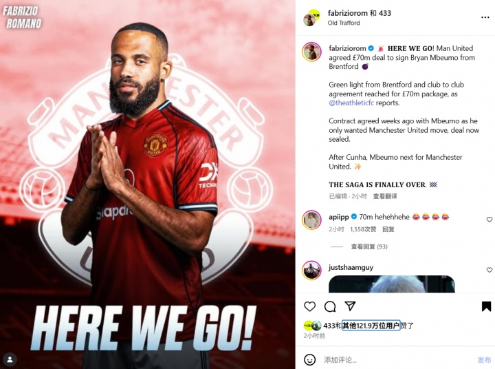 羅馬諾在社交媒體上以標志性的“Here we go”透露,曼聯(lián)簽下布倫特福德前鋒姆貝莫,轉會(huì )費總價(jià)7100萬(wàn)鎊,姆貝莫本人為羅馬諾的這條動(dòng)態(tài)點(diǎn)贊。