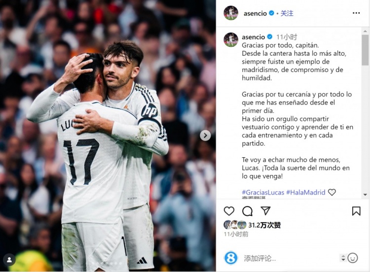勞爾-阿森西奧社媒曬出與巴斯克斯擁抱的照片,并寫(xiě)道:“感謝你所做的一切,隊長(cháng)。