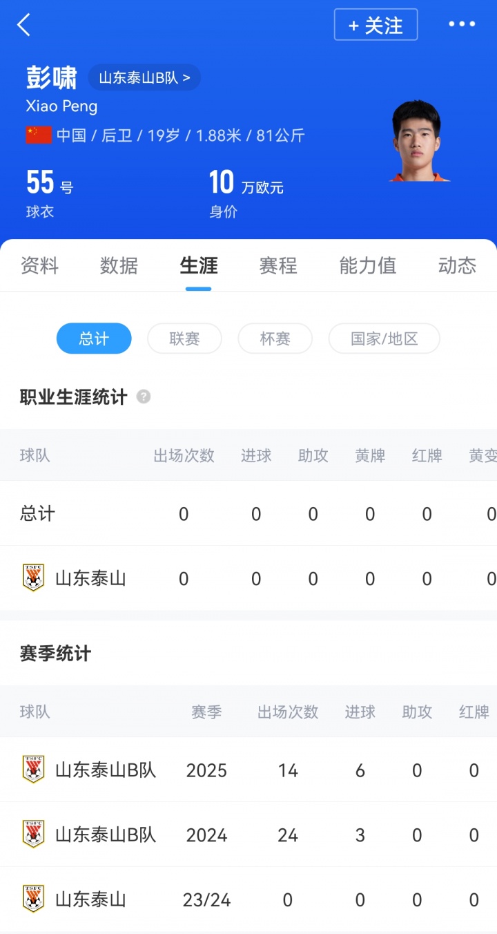 彭嘯本賽季為山東泰山B隊出場(chǎng)14次,打入6球,6粒進(jìn)球來(lái)自3場(chǎng)比賽的梅開(kāi)二度。