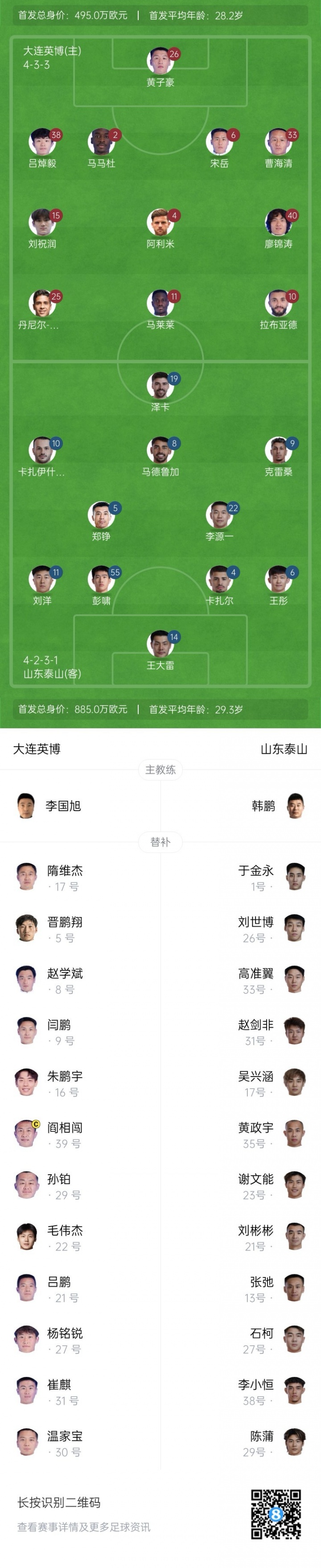 07月19日訊 北京時(shí)間19:00,中超第17輪,大連英博主場(chǎng)對陣山東泰山,賽前雙方首發(fā)陣容出爐!本場(chǎng)泰山隊由韓鵬出任代理主帥。