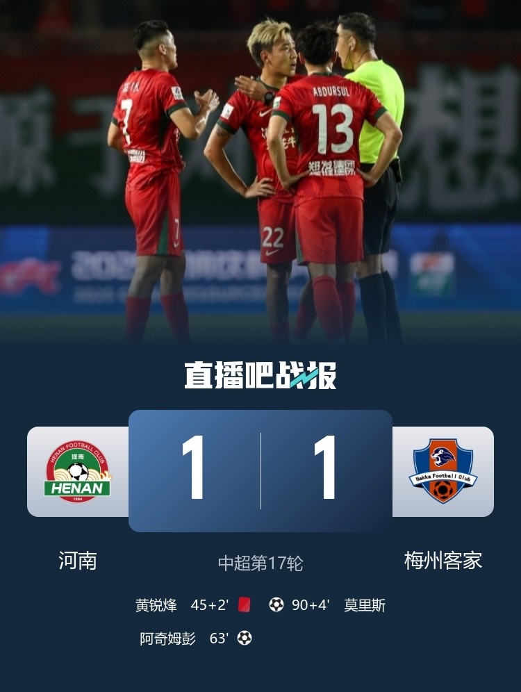 7月19日訊 北京時(shí)間7月19日晚上20:00,中超第17輪,河南坐鎮鄭州航海體育場(chǎng)迎戰梅州客家。上半場(chǎng),黃銳烽直紅,恩戈姆傷退。下半場(chǎng),阿奇姆彭頭球破門(mén),莫里斯94分鐘絕平。全場(chǎng)比賽結束,河南1-1梅州客家。本場(chǎng)過(guò)后,河南4輪不勝,積16分排名第13;梅州9輪不勝,積13分排名第14!