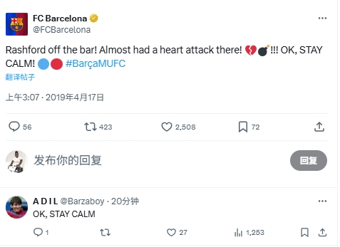 有球迷翻到19年4月17日歐冠巴薩vs曼聯(lián)時(shí),巴薩官方推特的一條推文:“拉什福德?lián)糁袡M梁!差點(diǎn)心臟病發(fā)作!好吧,冷靜!”球迷今日跟上評論:“好吧,冷靜!”