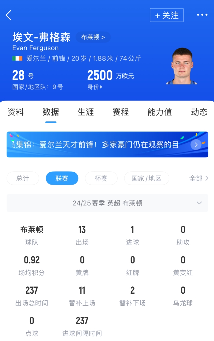 埃文-弗格森現年20歲,身高1米88司職中鋒,與布萊頓現有合同在2029年到期,現德轉估值2500萬(wàn)歐。