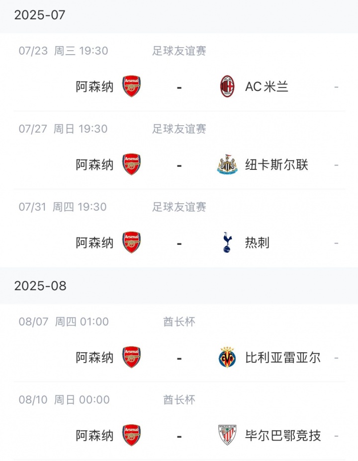 據此前報道,槍手將于7月23日(星期三)對陣AC米蘭,7月27日(星期日)對陣紐卡,兩場(chǎng)比賽都將在新加坡國家體育場(chǎng)進(jìn)行。