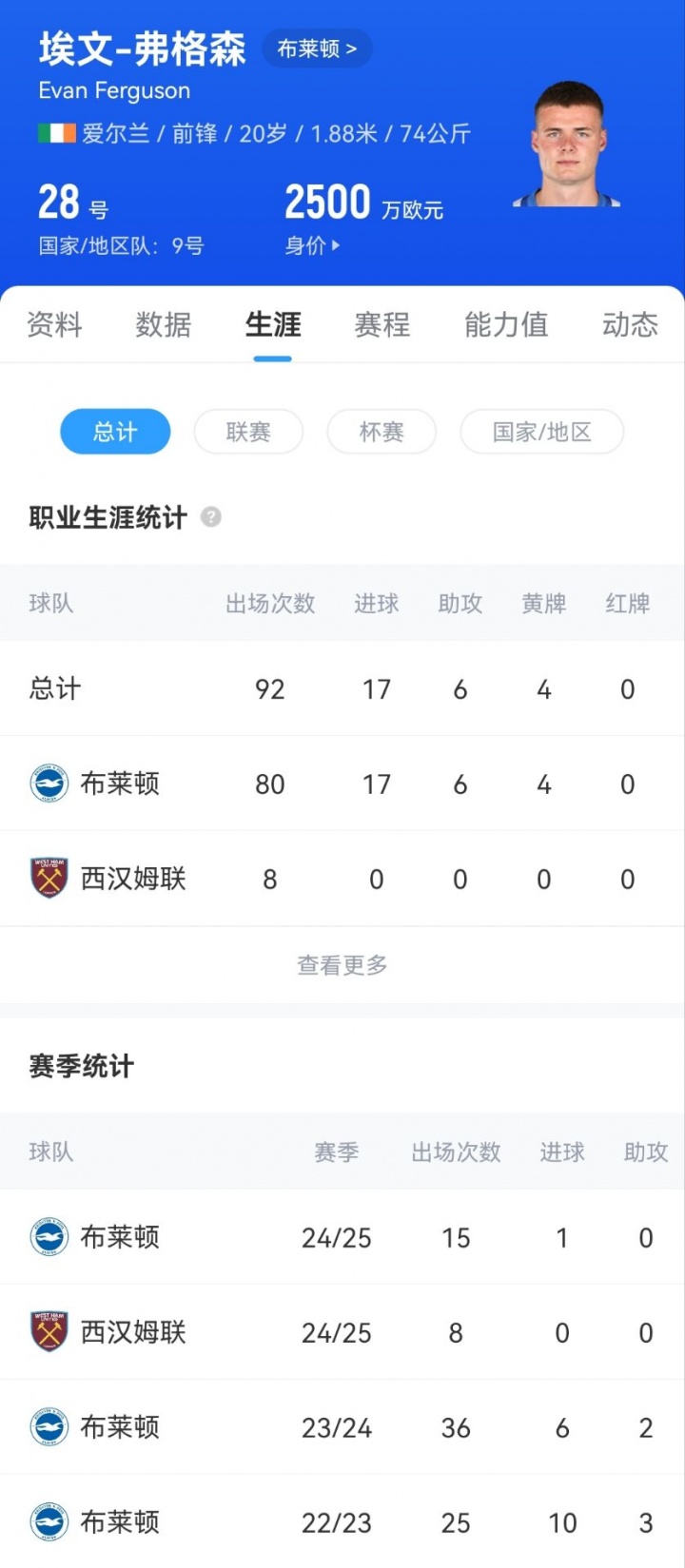 20歲的埃文-弗格森在兩年前也曾是萬(wàn)眾矚目的超新星,2022/23賽季中期,弗格森正式升入布萊頓一線(xiàn)隊,當賽季他在一線(xiàn)隊出場(chǎng)25次,貢獻10球3助攻。